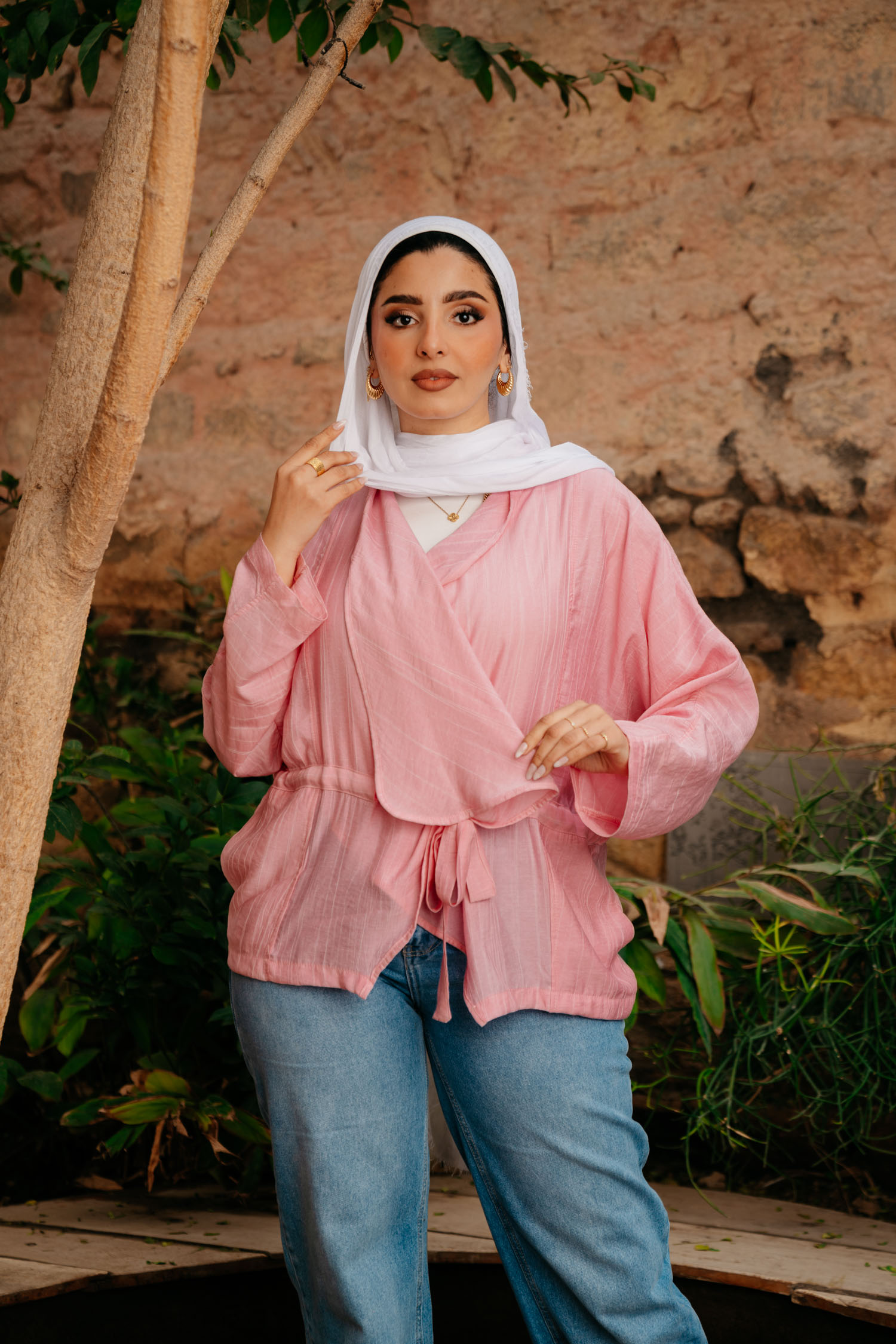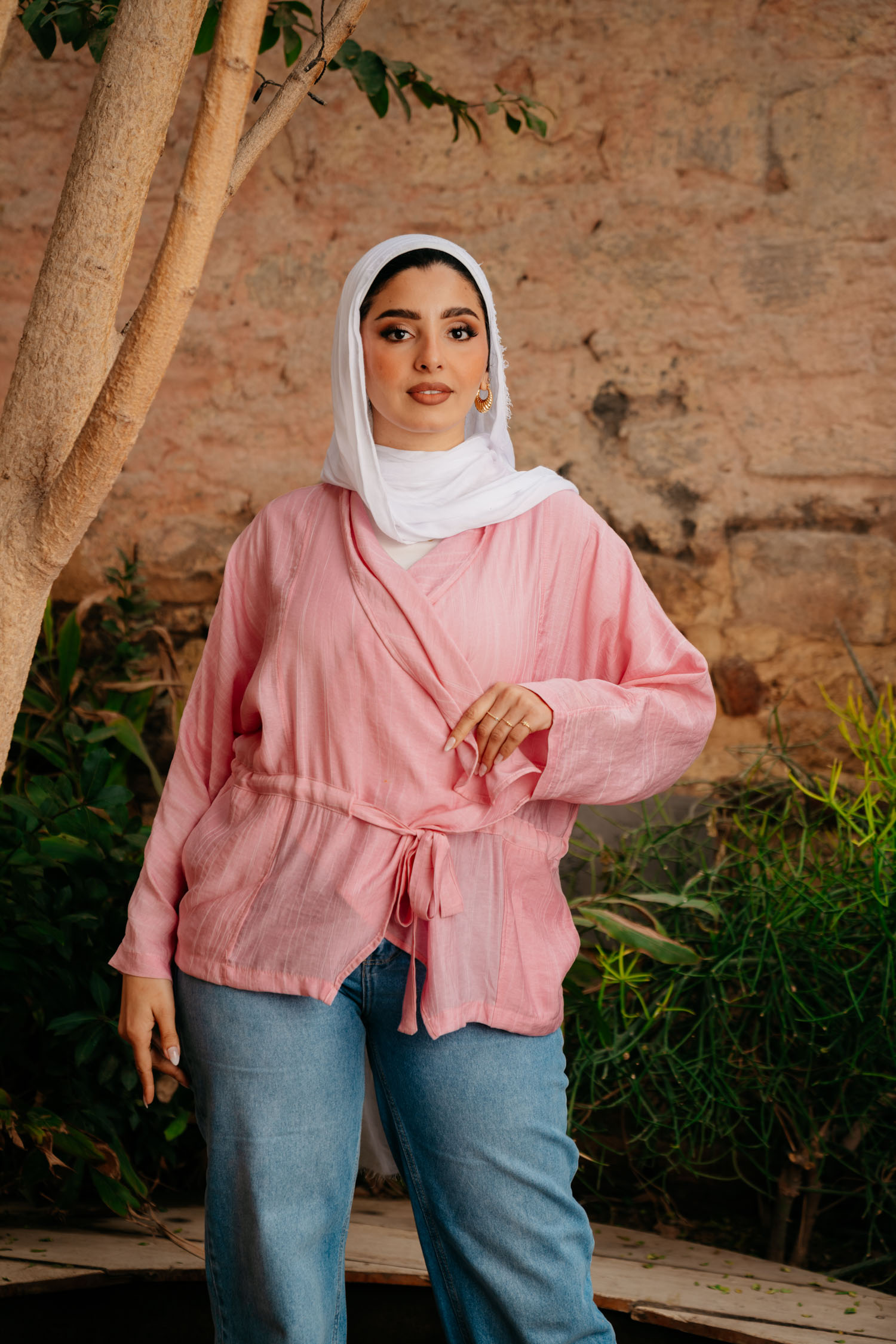 بلوزة كتان مخططة بلونين وتفاصيل دائرية على الصدر